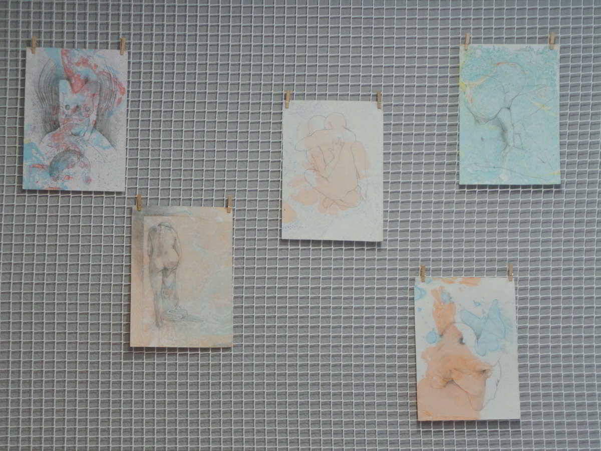 FIGURAS de nuestra coworker Lorelay Labrador. Aunque Lorelay no se dedica profesionalmente a ello, pues es diseñadora de stands , una parte de su obra, se adaptaba perfectamente al espacio expositivo de la Ínsula: piezas ligeras y frescas con una historia que contar en el que la FIGURA del cuerpo es la protagonista.